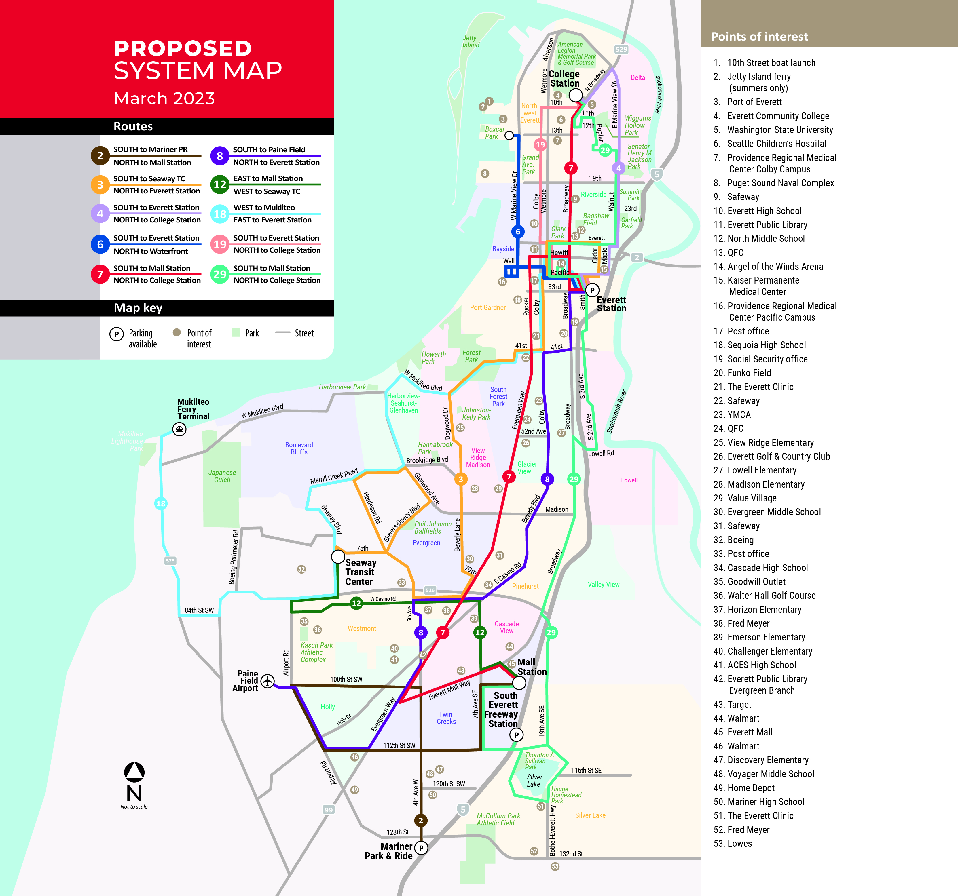 Everett Transit keeps safety top of mind when planning changes to service. To create a safe network for all our customers by implementing a more direct network, removing unnecessary route overlaps and redistributing service to more utilized areas.