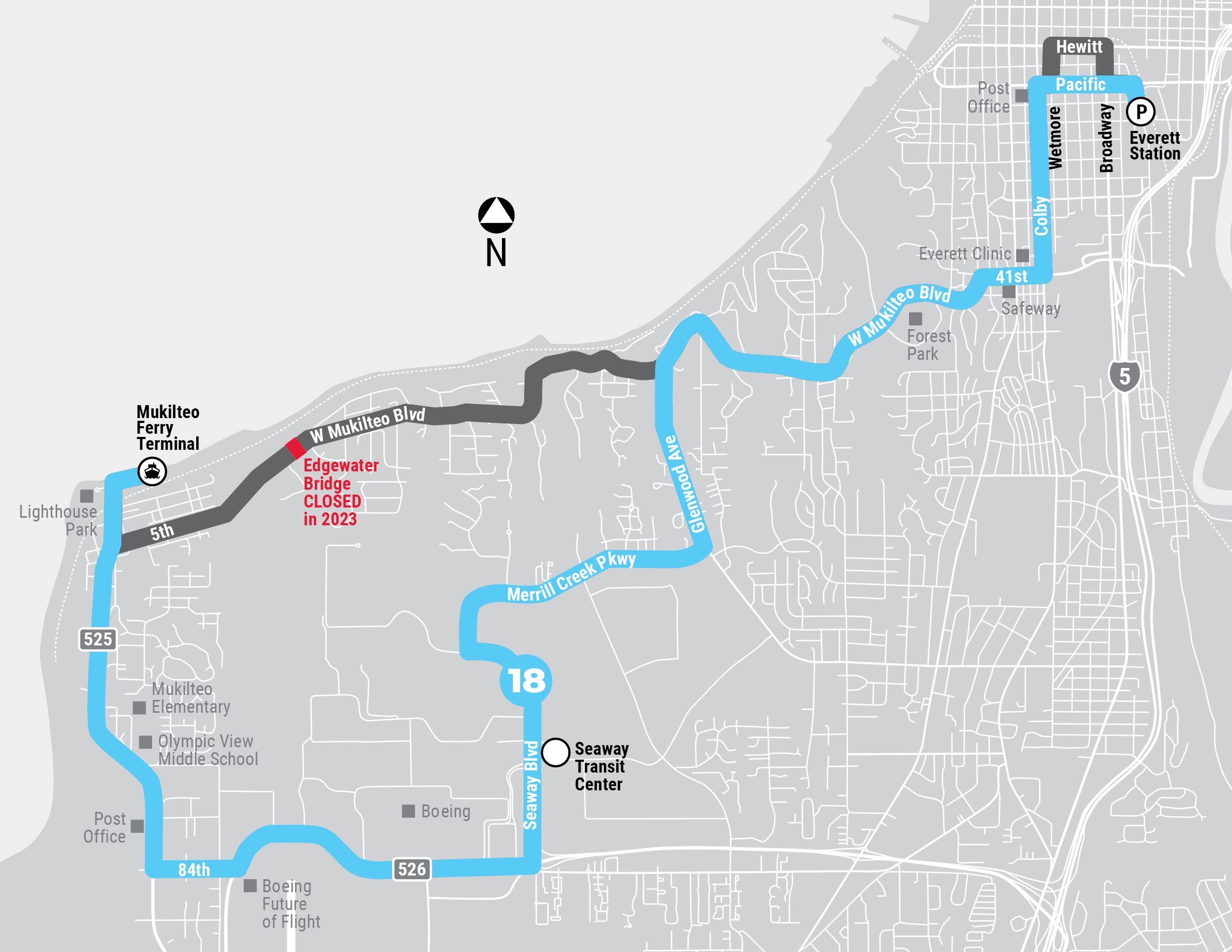 Route 18 will experience major changes to its service area. Due to bridge repair closures along Mukilteo Blvd., Route 18 is unable to access large portions of its current route. It will be rerouted to continue serving our community and deliver essential service between Mukilteo Ferry Terminal and Everett Station. This route combines parts of the current Route 18 with portions of Route 70. Route 18 service will include Mukilteo Speedway, Seaway Blvd. and Merrill Creek Parkway before continuing to downtown Everett and ending at Everett Station.