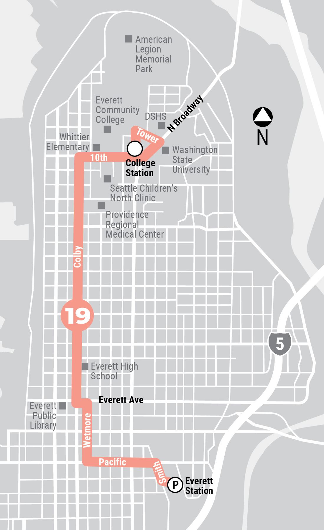 Route 19 re-introduces service to North Colby, Everett High School, Providence Medical Center (Colby campus) and businesses throughout downtown Everett while creating new, bi-directional connections to several other local and regional routes.