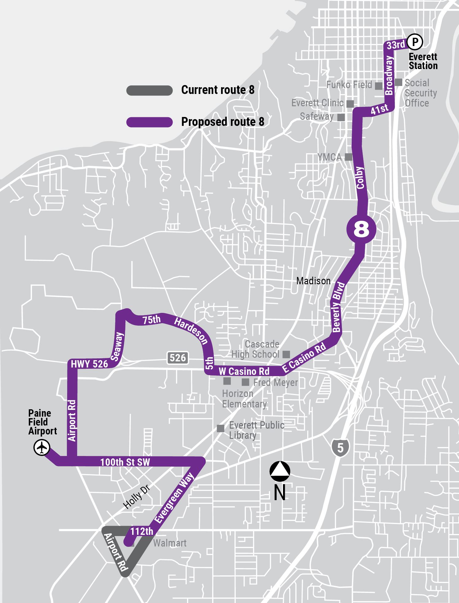 Route 8 service routing will remain unchanged and will continue offering bi-directional service between Everett Station and Paine Field Airport.